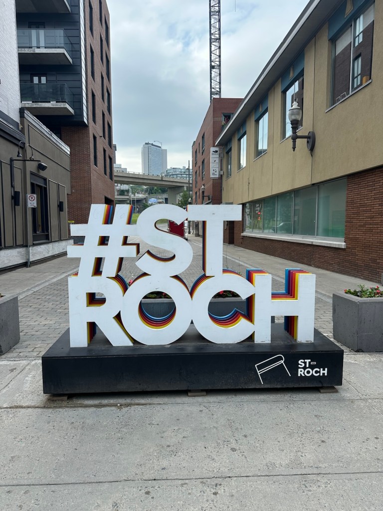 We joined a walking tour that began at the edge of the Saint-Roch district, where it meets Old Québec’s Lower Town. Nearby is a striking bronze statue called La Vivrière. Poised atop a pedestal, the woman cradles an armful of fruits and vegetables. Our guide explained that her graceful yet steadfast posture symbolizes both strength and serenity — as if she’s a guardian of nourishment. Modeled after a ship’s figurehead, the sculpture also pays tribute to Québec’s deep maritime roots.