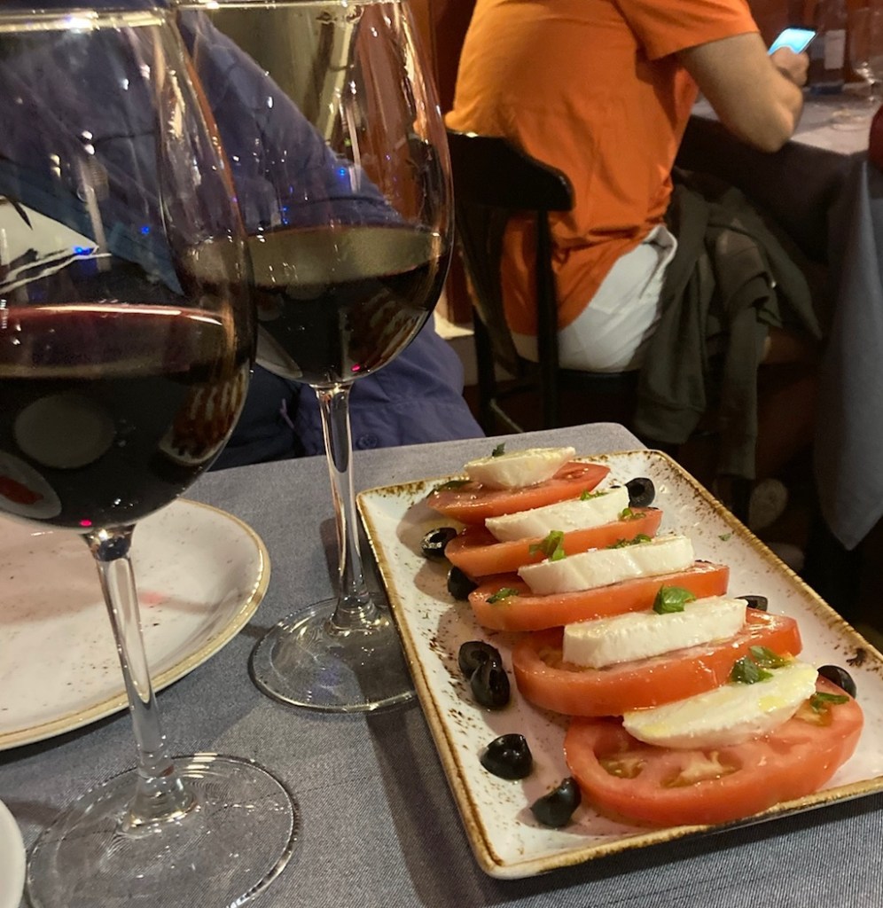 It’s easy to get lost here. It was a maze enclosed within the old town walls. We found a hidden treasure ‘hole-in-the wall’ for lunch. Best tomatoes ever topped with a locally made cheese and covered in olive oil, seasonings and herbs. Fabulous flavors.This little deli had the best seafood salad.After lunch, we managed to find our way out of the Old Town walls and back into the streets of Palma.Travelers fatigue was setting in so we headed back to our beach area. Here we see more of the German flavor with Pizza Berlin and you can also get Turkish Donar Kebap. Note: Turkish food is very popular in Germany because of all the Turkish guest workers hosted there. We bought a small bottle of Tunel hierbas to sample. Mallorca is the only place we saw this liqueur.