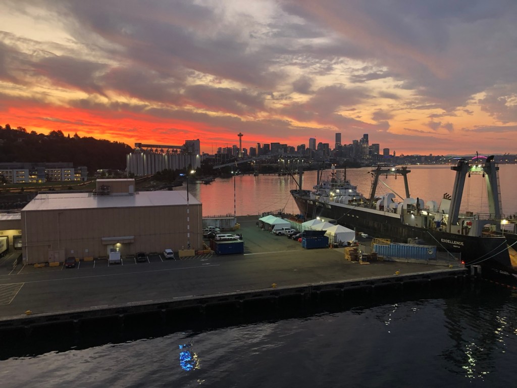 No coffee room-service this morning. Even though it was dark when we arrived in Seattle, our early morning awakening was rewarded with a beautiful sunrise over Seattle.